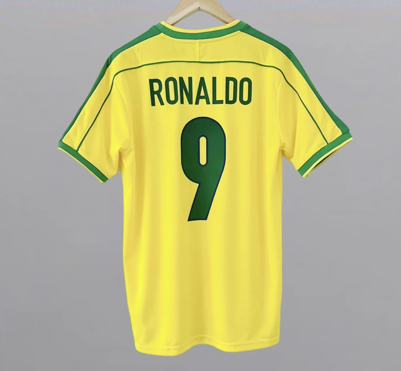 Image 1 of 2 Image 2 of 2 #9 Ronaldo Brazil 1998 Home Jersey $70.00 Size: S M L XL Quantity: Add To Cart Added!